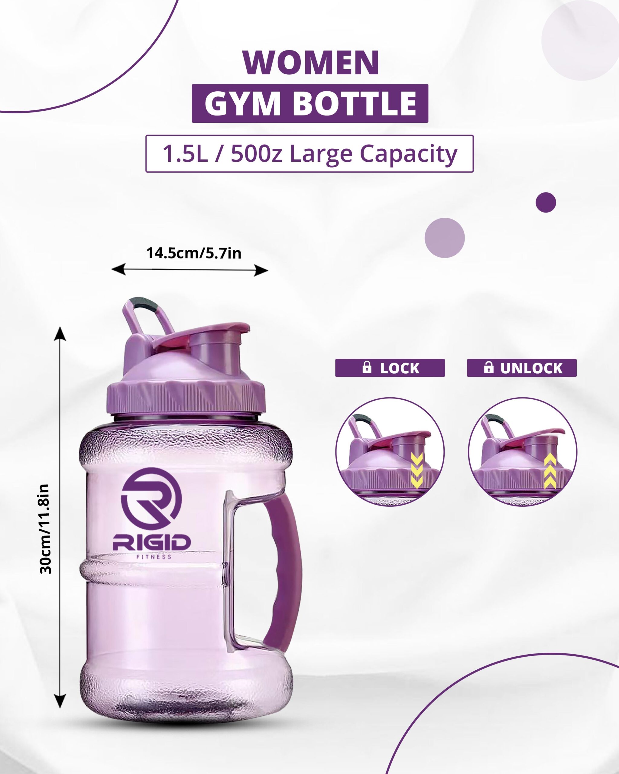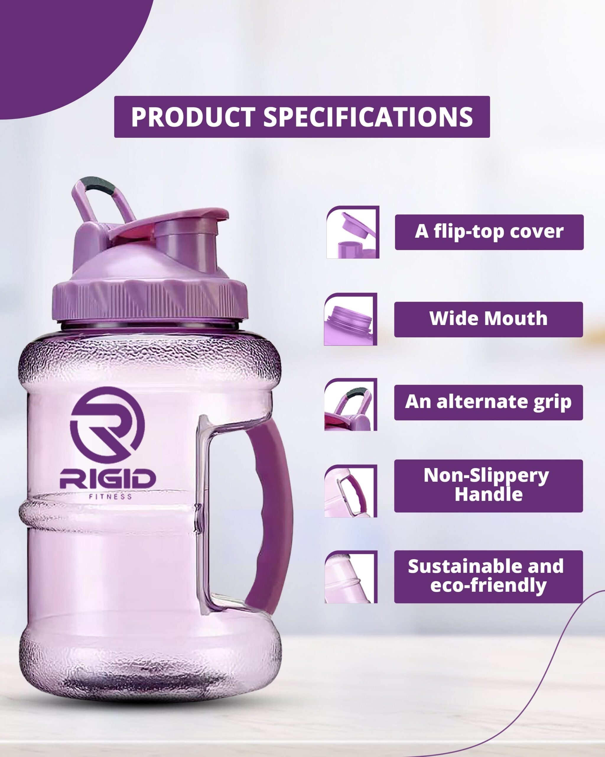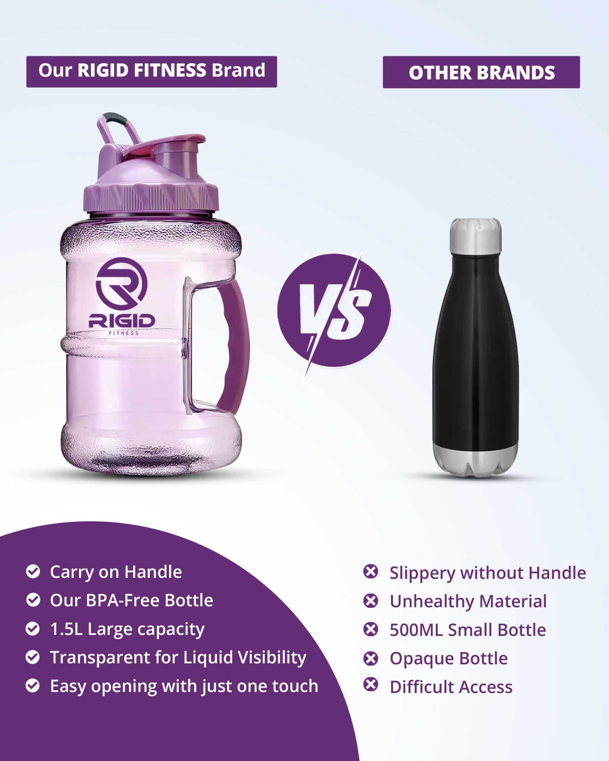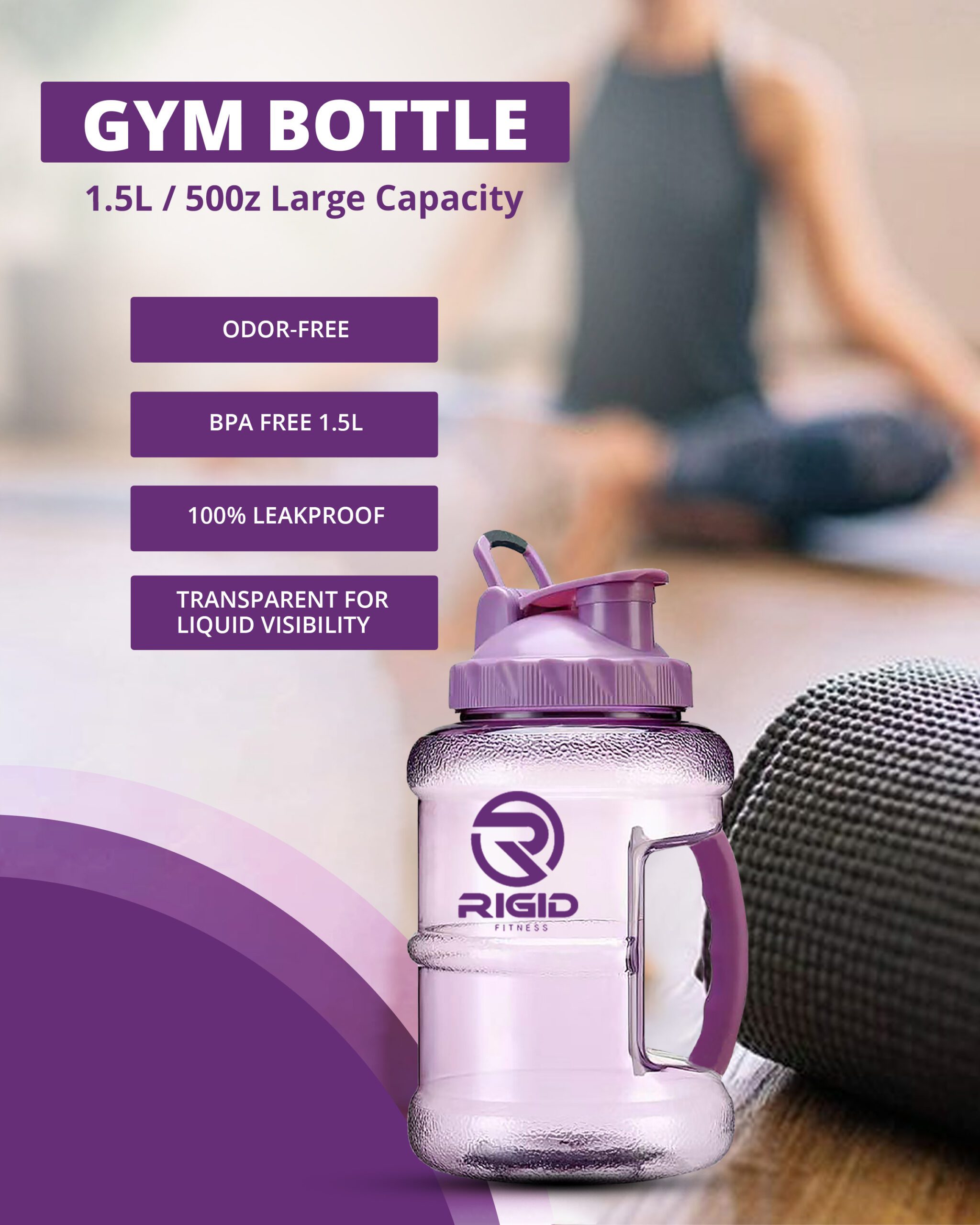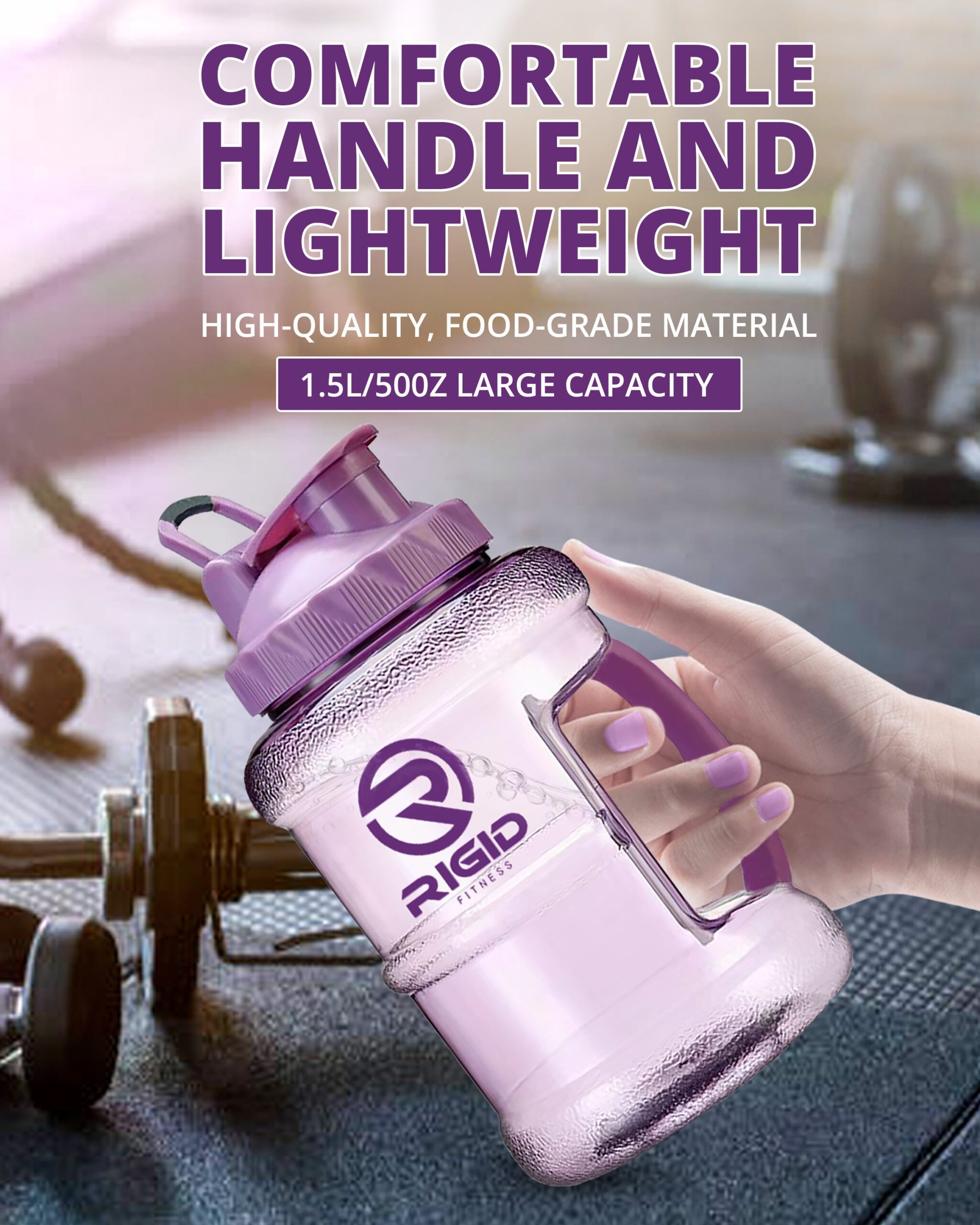 📋 [1.5L Gym Water Bottle – Leakproof BPA-Free Hydration Jug by RIGID FITNESS] Stay fit and hydrated with the RIGID FITNESS 1.5L gym water bottle, your ideal hydration partner for any active lifestyle. Designed for durability, style, and health, this BPA-free hydration jug combines form and function with a purple flair. Whether you’re in the gym, studio, or outdoors, this leakproof water jug keeps you refreshed and spill-free.