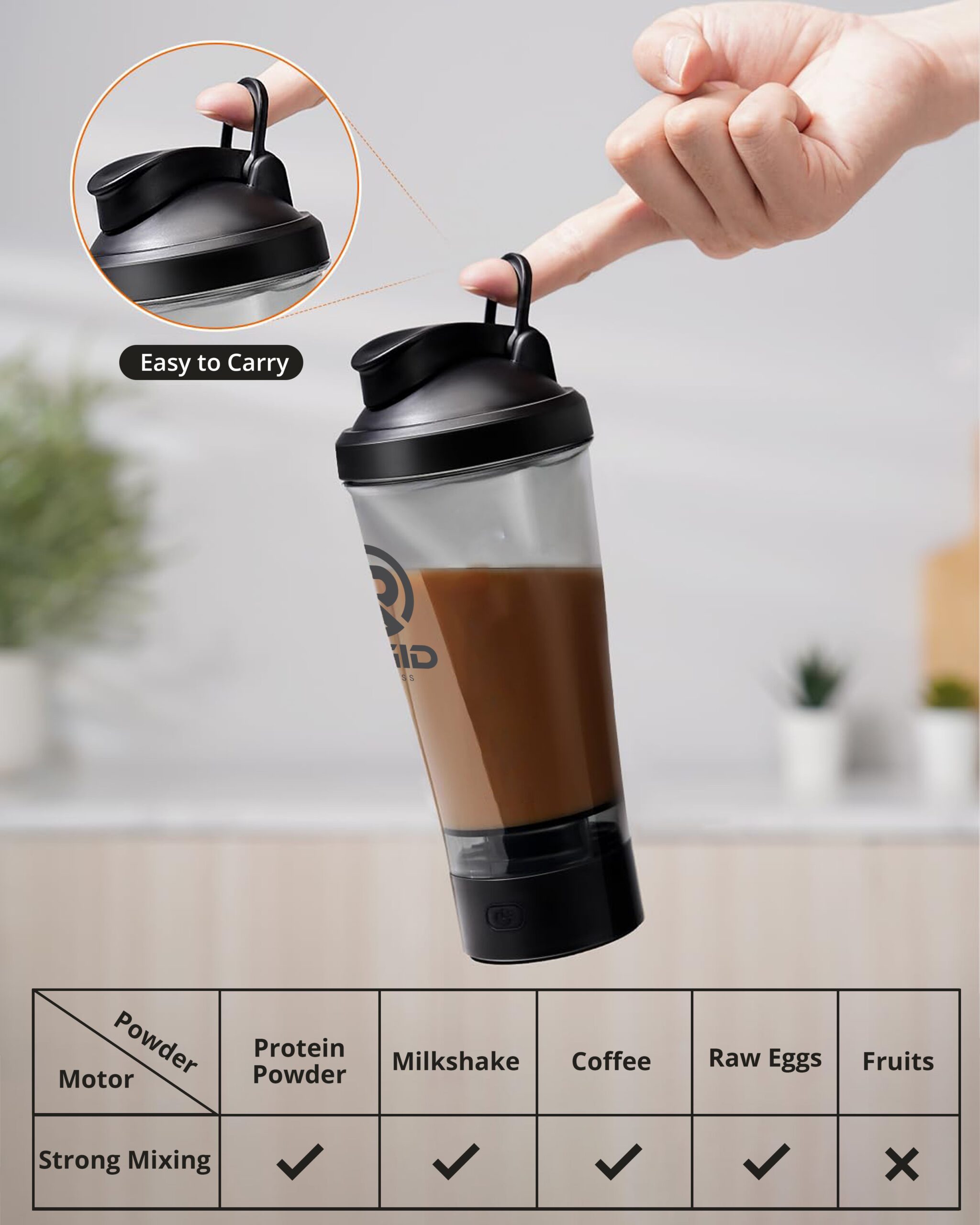 🎒 [Compact & Travel Friendly] Sleek and ergonomic, this lightweight electric protein shaker fits in cup holders, gym bags, and backpacks with ease.