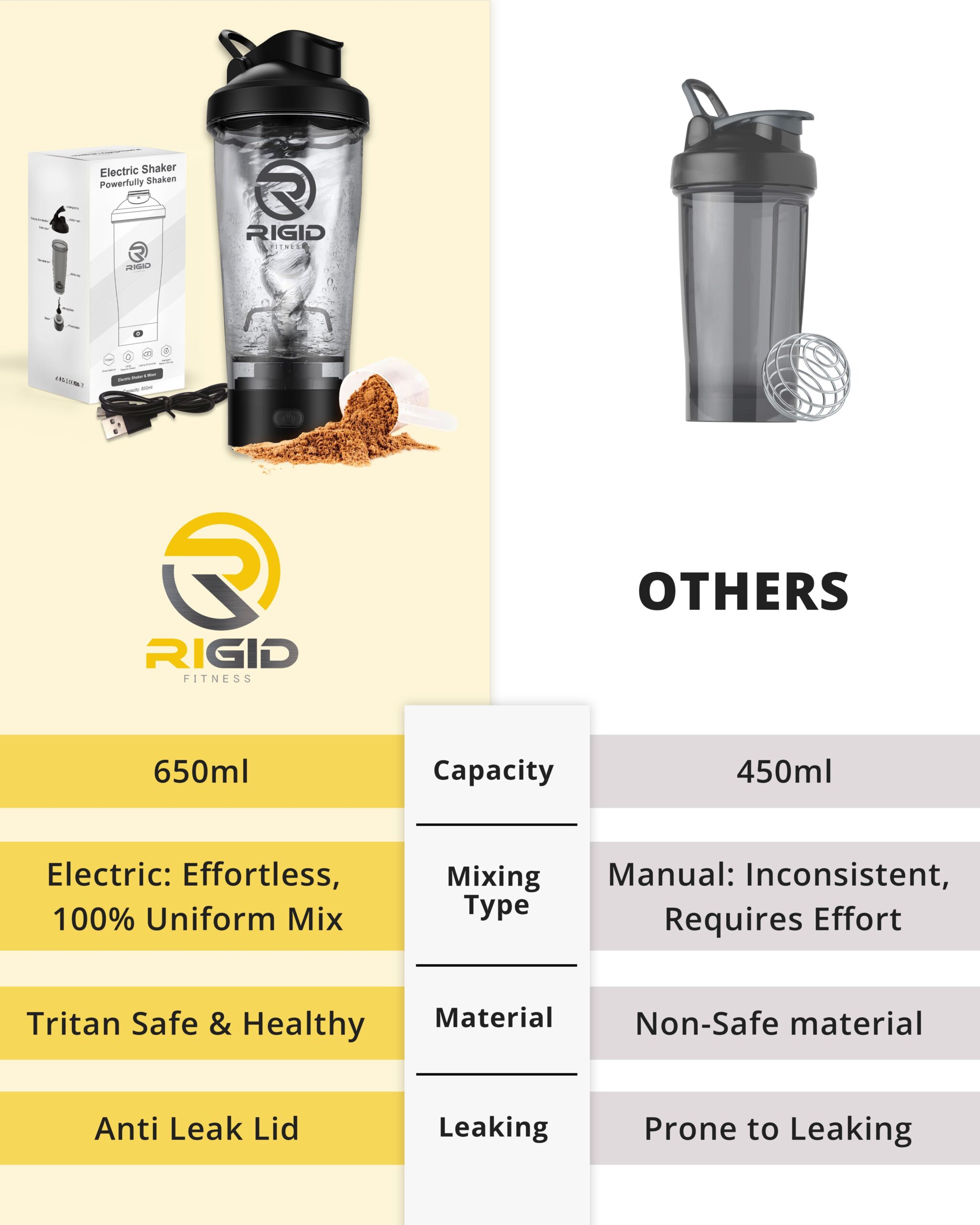 Power your post-workout routine with the RIGID FITNESS Electric Protein Shaker – your go-to solution for smooth, consistent shakes in 30 seconds or less. Whether you’re at the gym, in the office, or on the road, this bottle is built to fuel your recovery with zero clumps, zero spills, and zero excuses.