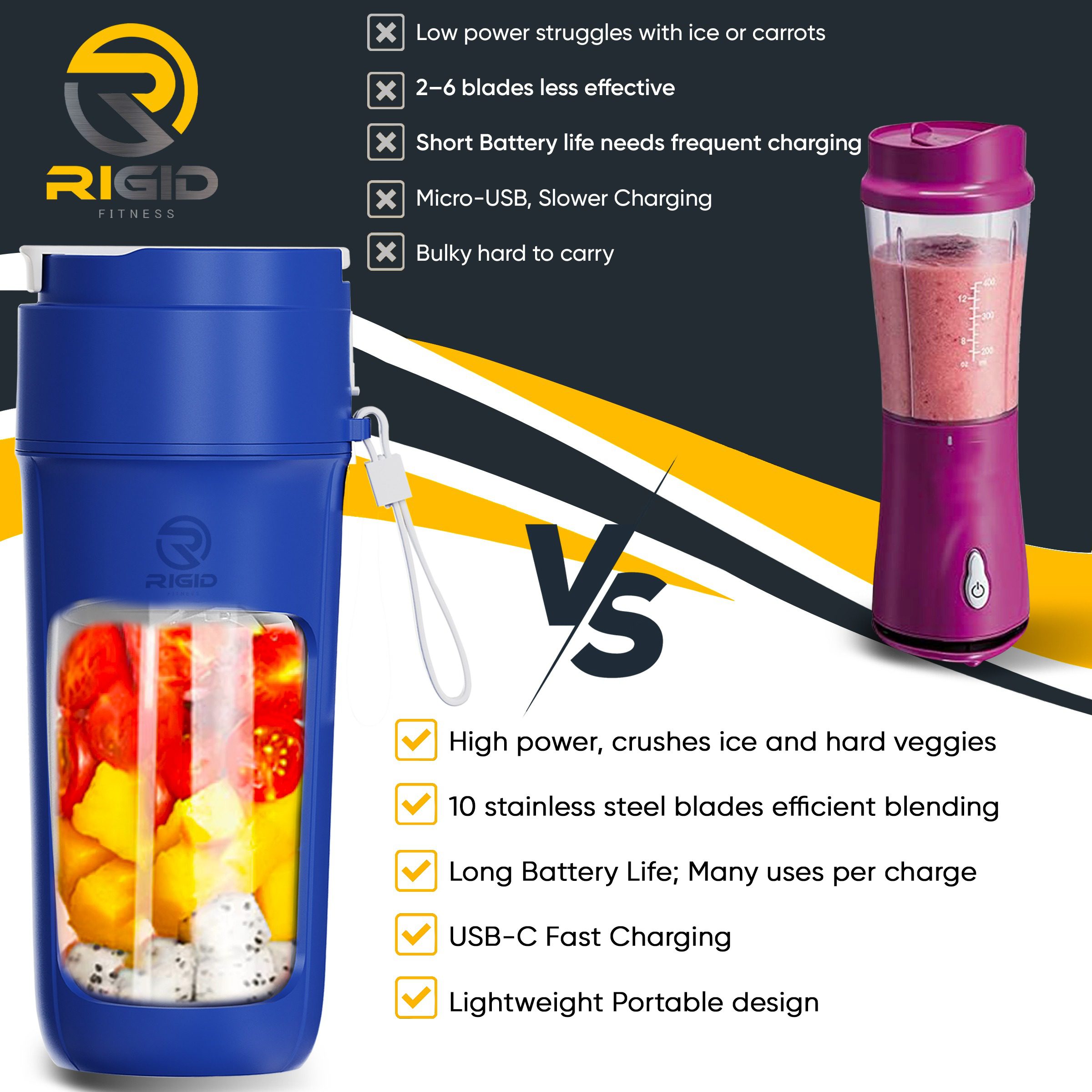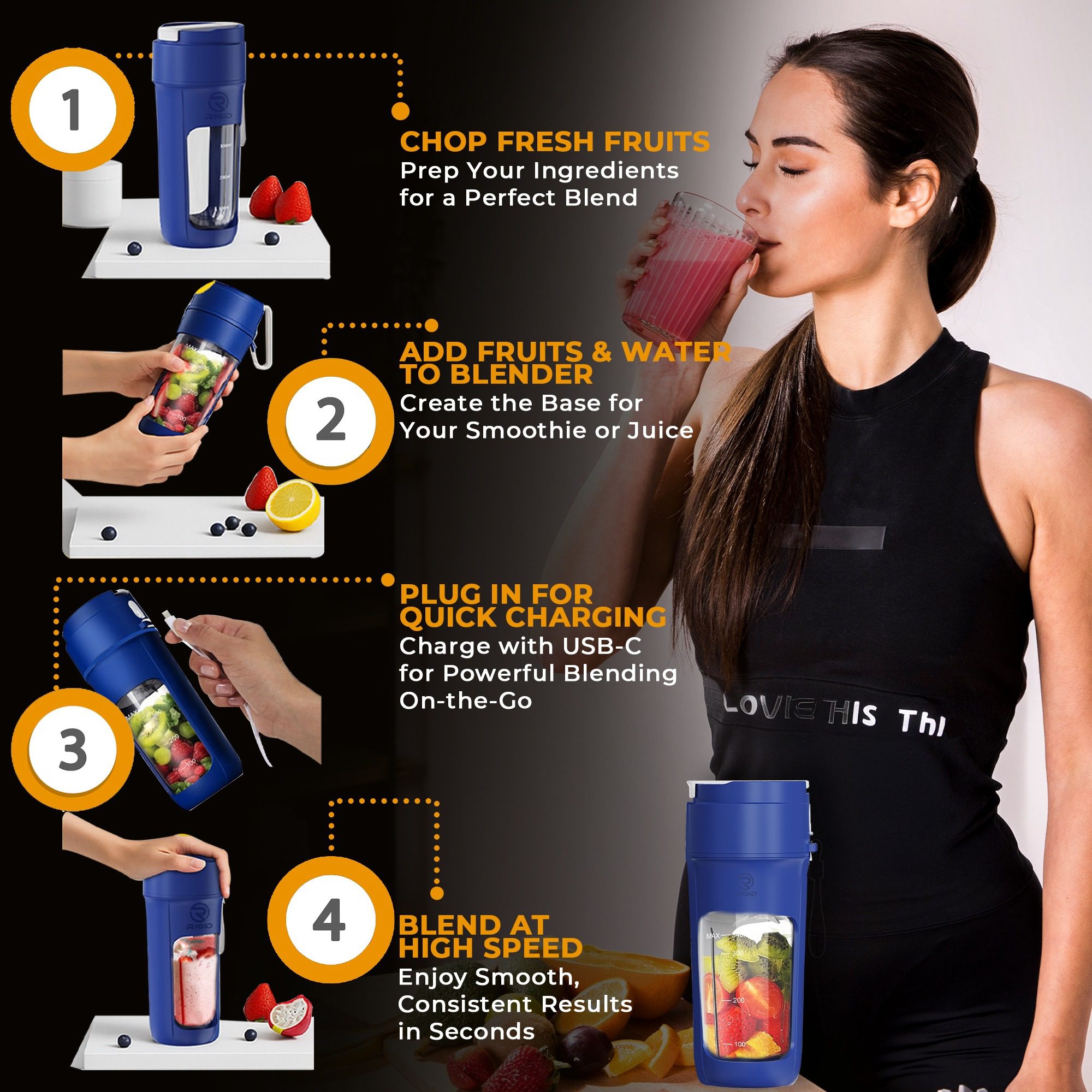 Upgrade your daily routine with the Rigid Fitness portable blender bottle-designed for life on the go. With an 11oz (340ml) capacity and durable build, it’s perfect for making fresh smoothies, shakes, and juices wherever you are. Whether you’re heading to the gym, commuting to work, or out on a weekend adventure, this travel blender supports your active lifestyle with ease and convenience.