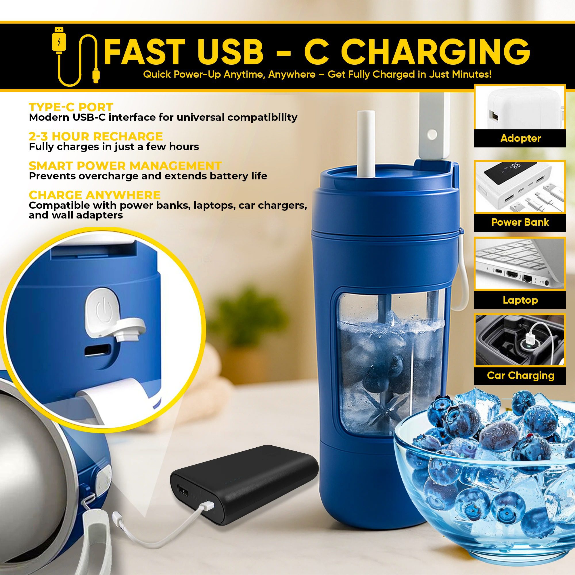 Enjoy fast, reliable charging with USB-C technology, delivering a full charge in just 2–3 hours. A double-click activation ensures no accidental blending, while the invert-to-start design helps prevent spills. Whether it’s a protein shake after your workout or a refreshing fruit drink mid-day, this BPA-free smoothie blender is built for performance and peace of mind.