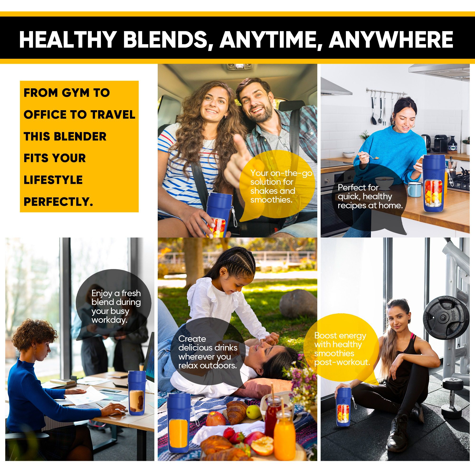 Compact, lightweight, and fitted with an ergonomic carry handle, this blender for gym use fits into your car cup holder or backpack with ease. Whether you’re camping, working, or training, this versatile and portable nutrition tool keeps your healthy habits on track. With a built-in lid that transforms the jar into a drinking bottle, you can blend and sip-anytime, anywhere.