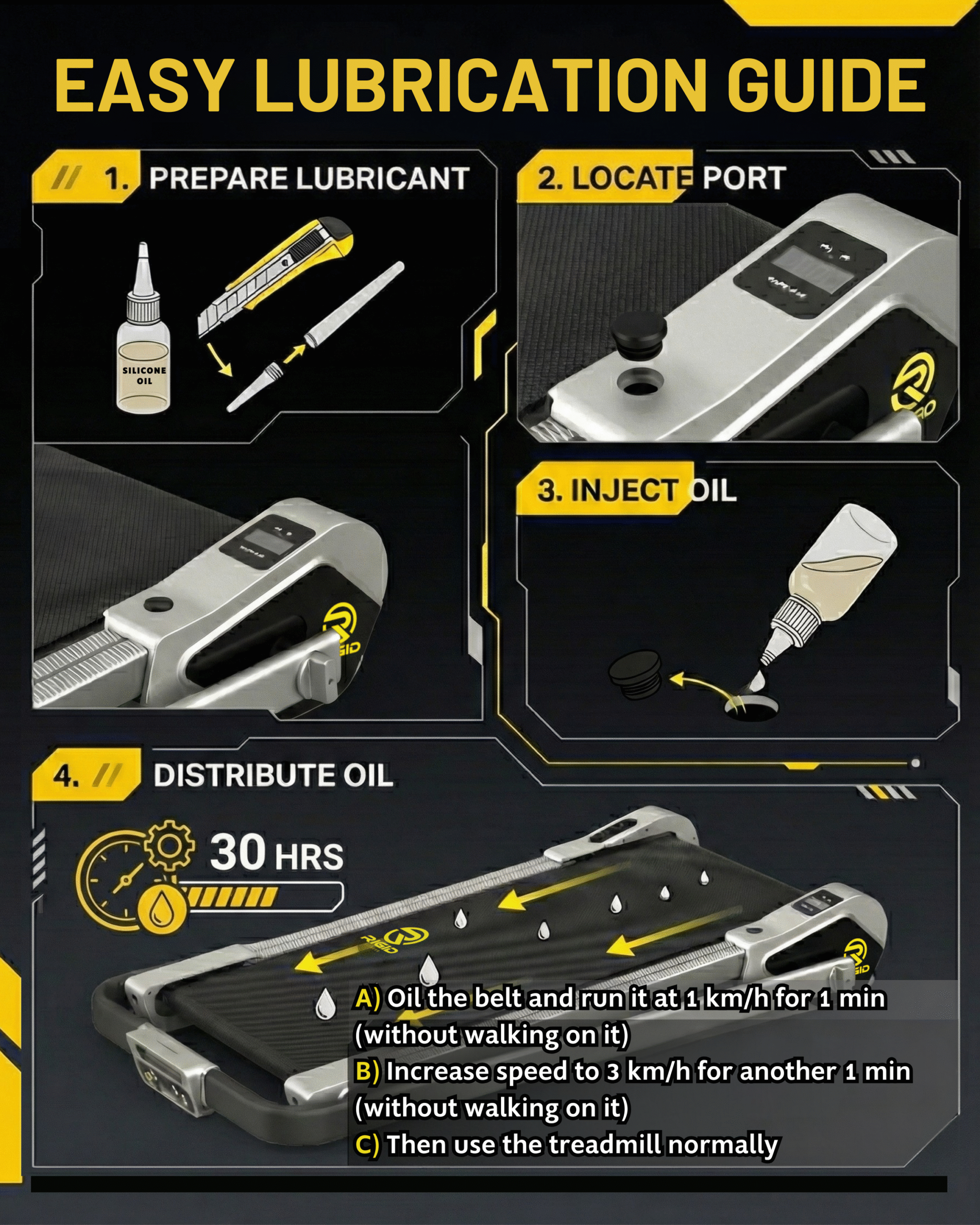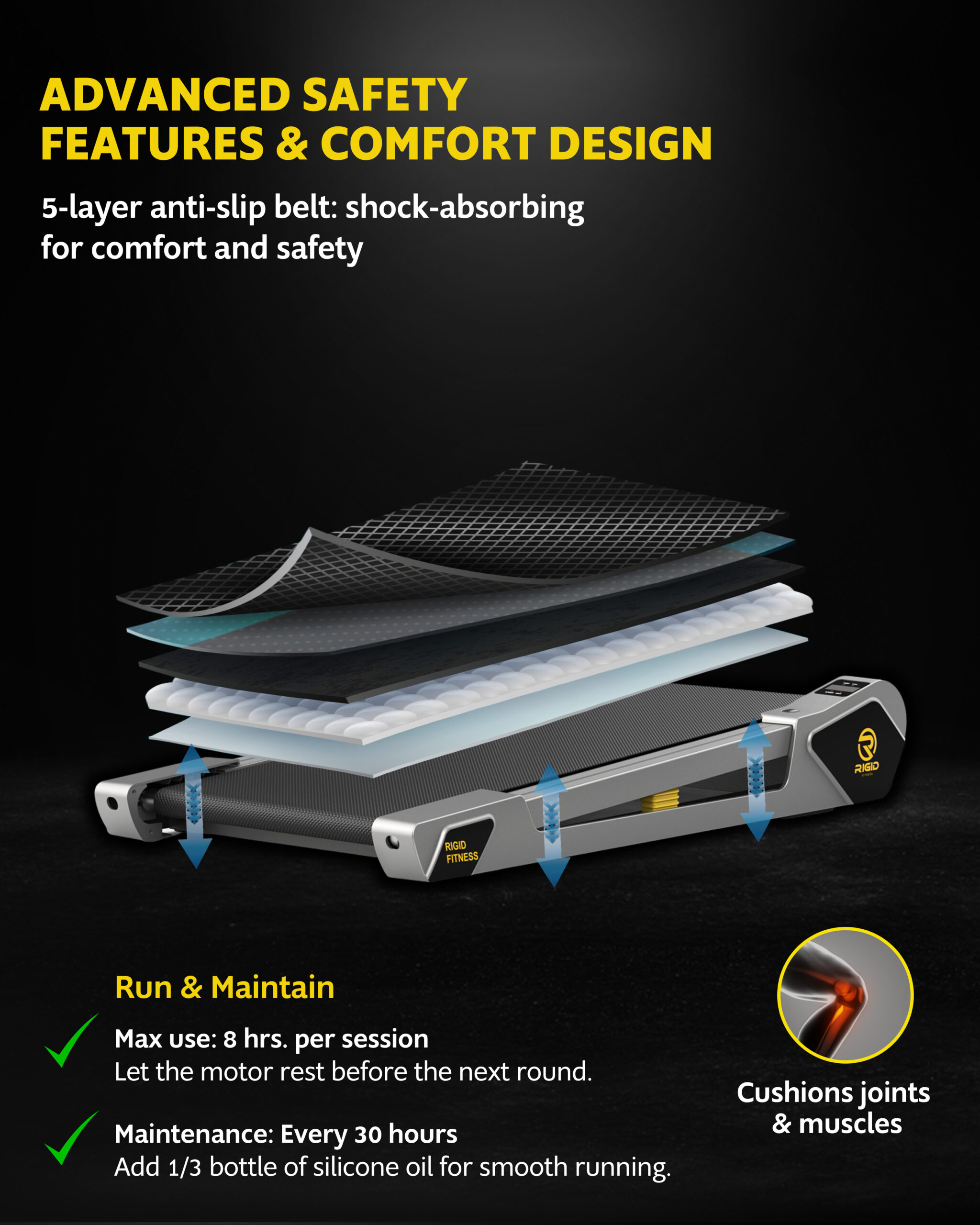 🦵 【Enhanced Safety & 5-Layer Running Belt】: Prioritizing your comfort and safety, the RIGID FITNESS Walking Pad features a high-quality, 5-layer anti-slip running belt. This belt provides superior grip and advanced shock-absorbing technology, significantly reducing impact on your joints and muscles for a comfortable, low-impact workout.